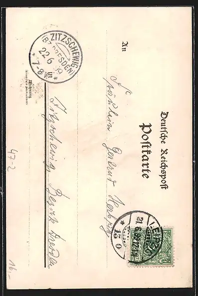 Personenbezogene Daten auf der Rückseite der Karte wurden durch blauen Textmarker unkenntlich gemacht. Die blauen Stellen sind auf die Vorderseite durchgeweicht und wirken sich negativ auf das Postkartenfoto aus