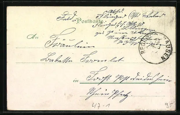 Personenbezogene Daten auf der Rückseite der Karte wurden durch blauen Textmarker unkenntlich gemacht. Die blauen Stellen sind auf die Vorderseite durchgeweicht und wirken sich negativ auf das Postkartenfoto aus