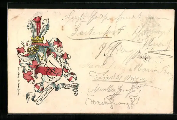 Lithographie Studentenwappen in rot und weiss mit Motto Post nubila Phöbus