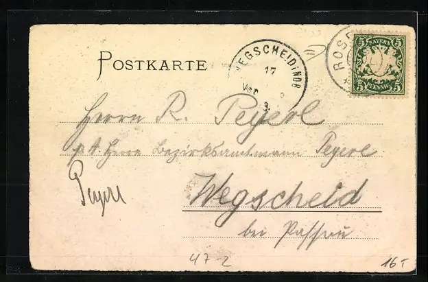 Personenbezogene Daten auf der Rückseite der Karte wurden durch blauen Textmarker unkenntlich gemacht. Die blauen Stellen sind auf die Vorderseite durchgeweicht und wirken sich negativ auf das Postkartenfoto aus