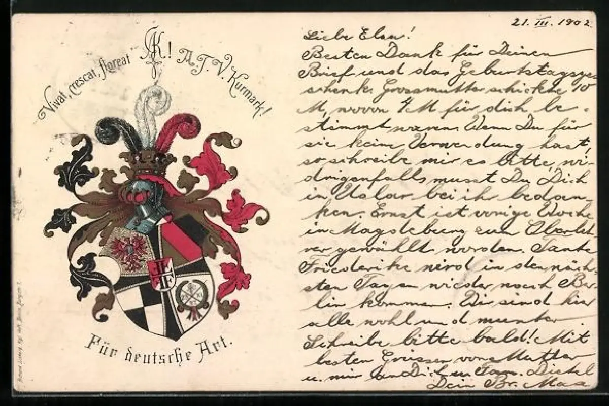 Lithographie Studentenwappen mit Helm, A. T. V. Kurmark, Vivat, crescat, floreat