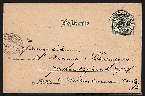 Personenbezogene Daten auf der Rückseite der Karte wurden durch blauen Textmarker unkenntlich gemacht. Die blauen Stellen sind auf die Vorderseite durchgeweicht und wirken sich negativ auf das Postkartenfoto aus