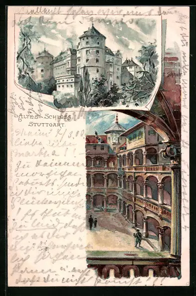 Lithographie Stuttgart, Altes Schloss, Innenhof