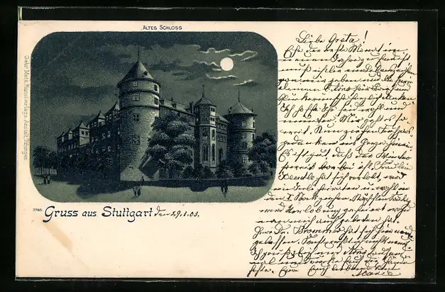 Lithographie Stuttgart, Altes Schloss bei Mondschein