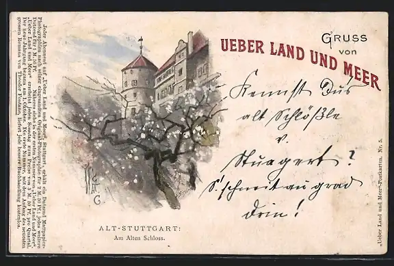 Lithographie Stuttgart, Altes Schloss im Frühling