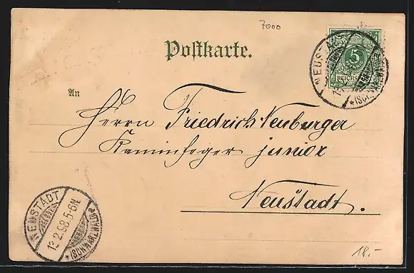 Personenbezogene Daten auf der Rückseite der Karte wurden durch blauen Textmarker unkenntlich gemacht. Die blauen Stellen sind auf die Vorderseite durchgeweicht und wirken sich negativ auf das Postkartenfoto aus