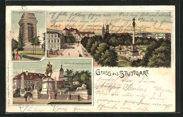 Lithographie Stuttgart, Bismarcksäule, Schlossplatz, Kaiser-Wilhelm-Denkmal