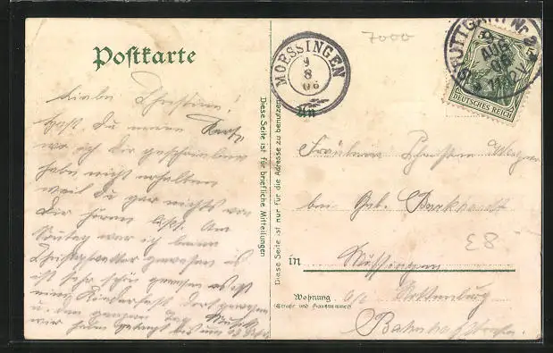 gelaufen 1906, Eckknicke oben, Einriss unten li., guter Zustand