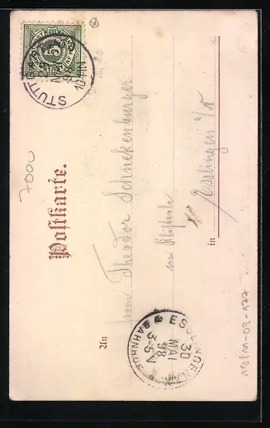 Personenbezogene Daten auf der Rückseite der Karte wurden durch blauen Textmarker unkenntlich gemacht. Die blauen Stellen sind auf die Vorderseite durchgeweicht und wirken sich negativ auf das Postkartenfoto aus