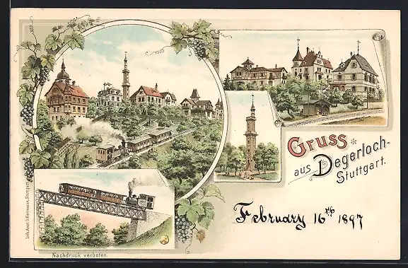 Lithographie Stuttgart-Degerloch, Ortspartie mit Bergbahn, Turm