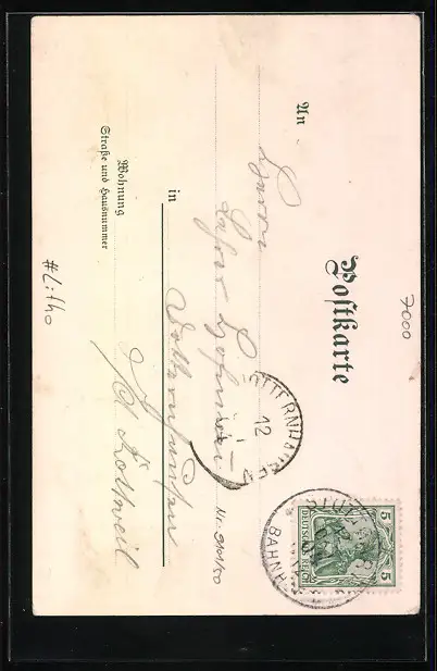Personenbezogene Daten auf der Rückseite der Karte wurden durch blauen Textmarker unkenntlich gemacht. Die blauen Stellen sind auf die Vorderseite durchgeweicht und wirken sich negativ auf das Postkartenfoto aus