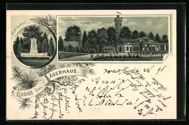Lithographie Stuttgart-Hasenberg, Gasthaus Jägerhaus mit Aussichtsturm, Hauff-Denkmal