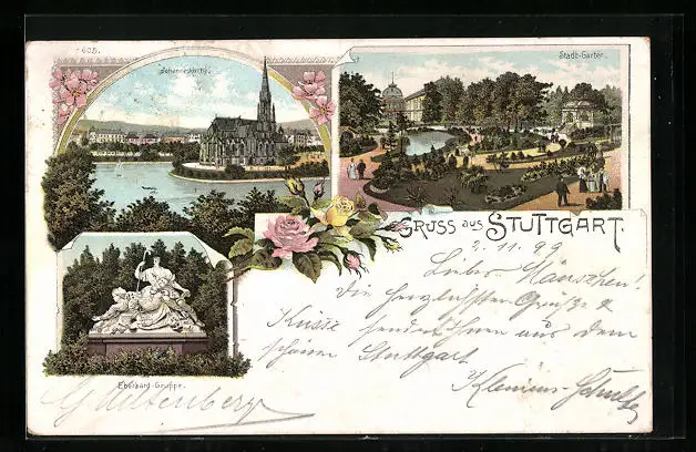 Lithographie Stuttgart, Johanneskirche, Stadt-Garten, Eberhard-Gruppe