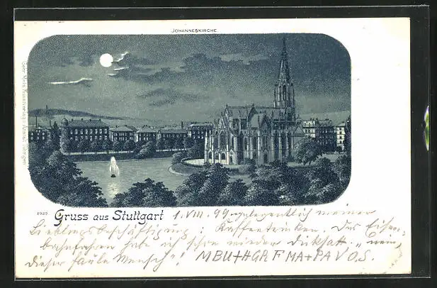 Lithographie Stuttgart, Johanneskirche bei Mondschein