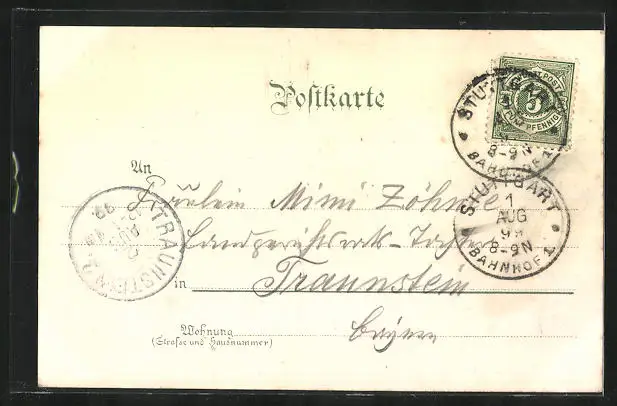 Personenbezogene Daten auf der Rückseite der Karte wurden durch blauen Textmarker unkenntlich gemacht. Die blauen Stellen sind auf die Vorderseite durchgeweicht und wirken sich negativ auf das Postkartenfoto aus