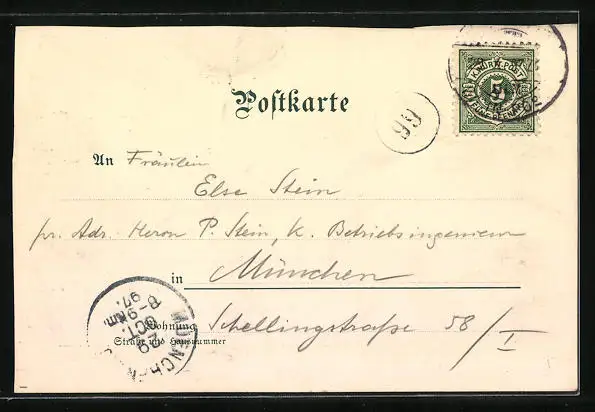 Personenbezogene Daten auf der Rückseite der Karte wurden durch blauen Textmarker unkenntlich gemacht. Die blauen Stellen sind auf die Vorderseite durchgeweicht und wirken sich negativ auf das Postkartenfoto aus