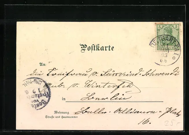 Personenbezogene Daten auf der Rückseite der Karte wurden durch blauen Textmarker unkenntlich gemacht. Die blauen Stellen sind auf die Vorderseite durchgeweicht und wirken sich negativ auf das Postkartenfoto aus