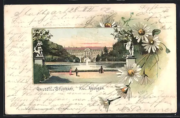 Lithographie Stuttgart, Kgl.Anlagen mit Springbrunnen