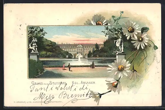 Lithographie Stuttgart, Kgl.Anlagen mit Springbrunnen