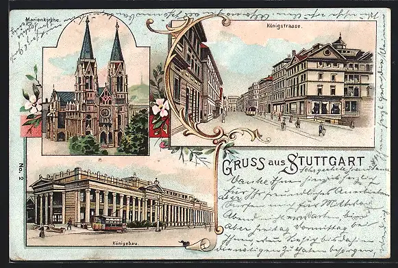 Lithographie Stuttgart, Königstrasse, Marienkirche, Königsbau mit Strassenbahn