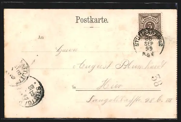 Personenbezogene Daten auf der Rückseite der Karte wurden durch blauen Textmarker unkenntlich gemacht. Die blauen Stellen sind auf die Vorderseite durchgeweicht und wirken sich negativ auf das Postkartenfoto aus