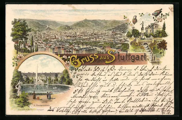 Lithographie Stuttgart, Ortsansicht aus der Vogelschau und K. Residenzschloss