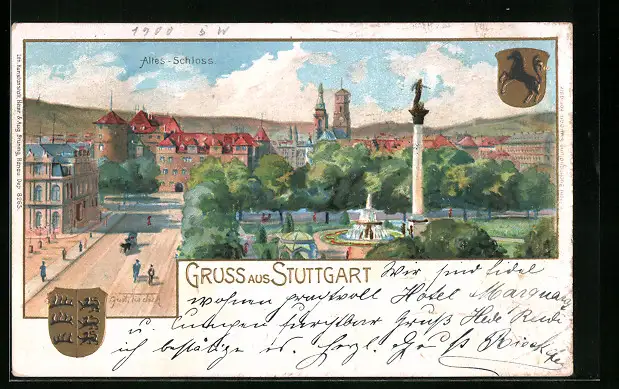 Lithographie Stuttgart, Ortspartie mit altem Schloss