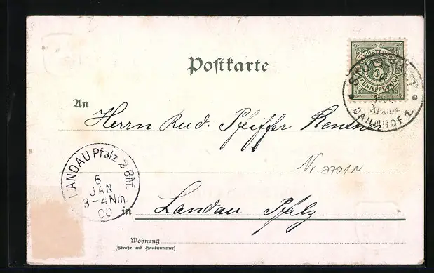 gelaufen 1900, Eckknick re. unten, rückseitig Oberflächenschaden, guter Zustand