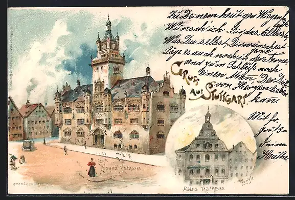 Lithographie Stuttgart, Partie am Neuen Rathaus