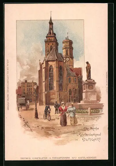 Lithographie Stuttgart, Partie an der Stadtkirche, Schillerdenkmal