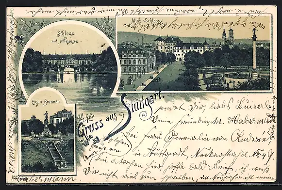 Lithographie Stuttgart, Schloss mit Anlagensee, Eugen-Brunnen, Altes Schloss