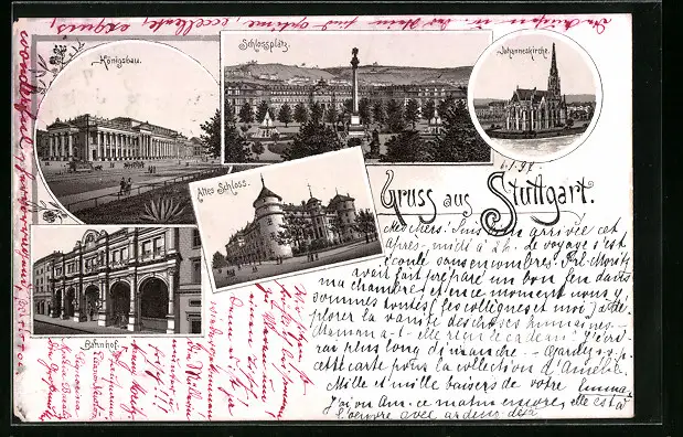 Lithographie Stuttgart, Schlossplatz, Bahnhof, Johanneskirche