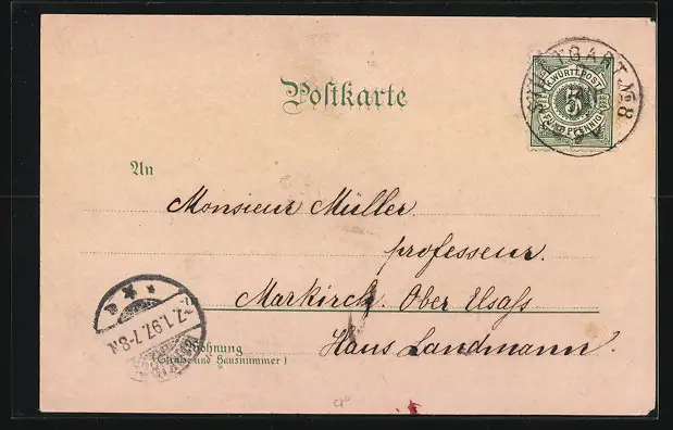 Personenbezogene Daten auf der Rückseite der Karte wurden durch blauen Textmarker unkenntlich gemacht. Die blauen Stellen sind auf die Vorderseite durchgeweicht und wirken sich negativ auf das Postkartenfoto aus