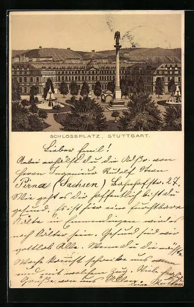 Lithographie Stuttgart, Schlossplatz mit Denkmal und Springbrunnen
