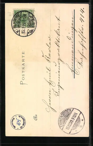 Personenbezogene Daten auf der Rückseite der Karte wurden durch blauen Textmarker unkenntlich gemacht. Die blauen Stellen sind auf die Vorderseite durchgeweicht und wirken sich negativ auf das Postkartenfoto aus