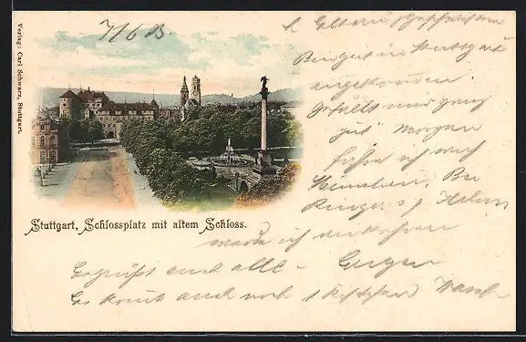 Lithographie Stuttgart, Schlossplatz mit altem Schloss