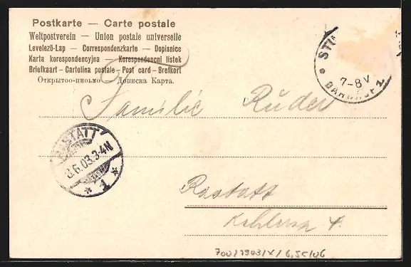 gelaufen 1903, Briefmarke entfernt, rückseitig Oberflächenschaden, guter Zustand