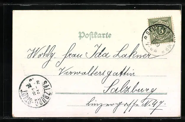 Personenbezogene Daten auf der Rückseite der Karte wurden durch blauen Textmarker unkenntlich gemacht. Die blauen Stellen sind auf die Vorderseite durchgeweicht und wirken sich negativ auf das Postkartenfoto aus