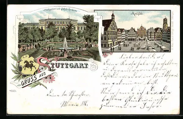 Lithographie Stuttgart, Stadtgarten und Polytechnikum, Marktplatz