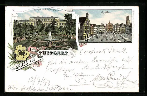 Lithographie Stuttgart, Stadtgarten und Polytechnikum, Marktplatz