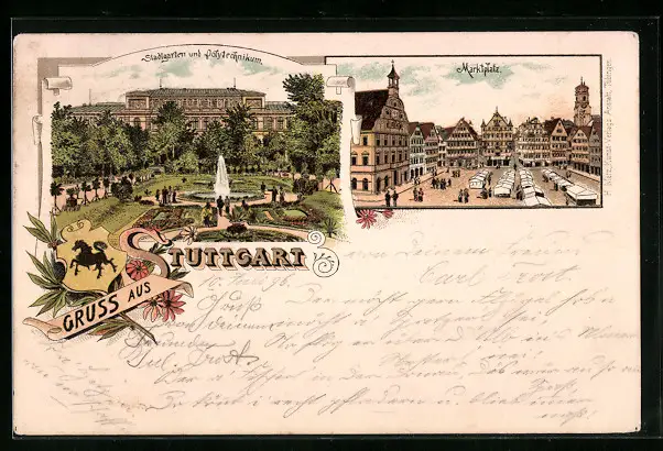 Lithographie Stuttgart, Stadtgarten und Polytechnikum, Marktplatz