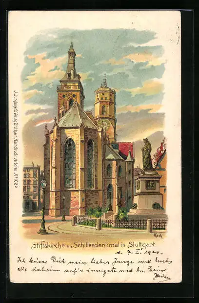 Lithographie Stuttgart, Stiftskirche u. Schillerdenkmal