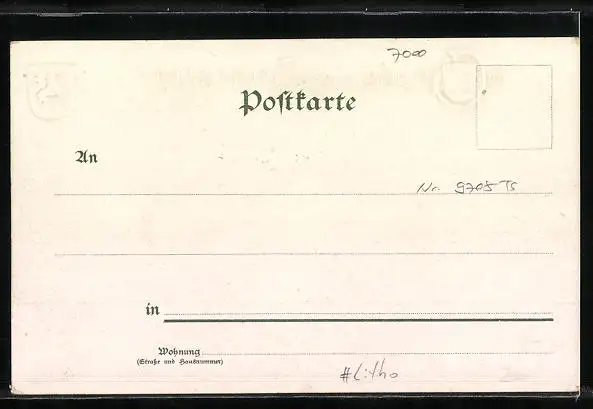 Personenbezogene Daten auf der Rückseite der Karte wurden durch blauen Textmarker unkenntlich gemacht. Die blauen Stellen sind auf die Vorderseite durchgeweicht und wirken sich negativ auf das Postkartenfoto aus
