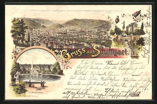 Lithographie Stuttgart, Teilansicht, K. Residenzschloss, Eugensbrunnen