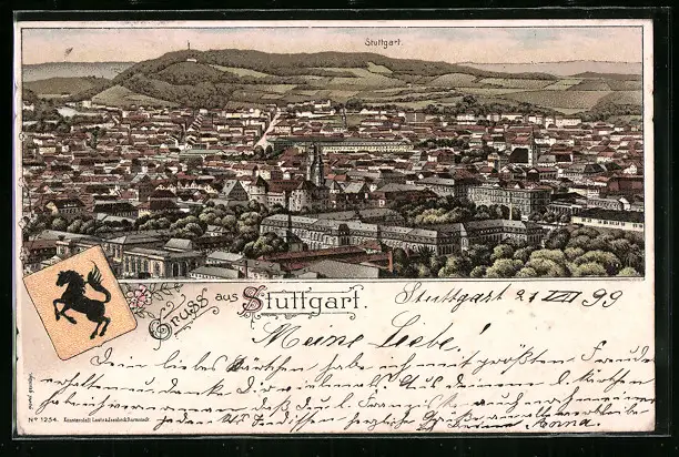Lithographie Stuttgart, Totalansicht aus der Vogelschau, Wappen