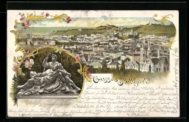 Lithographie Stuttgart, Totalansicht der Stadt, die Eberhards-Gruppe
