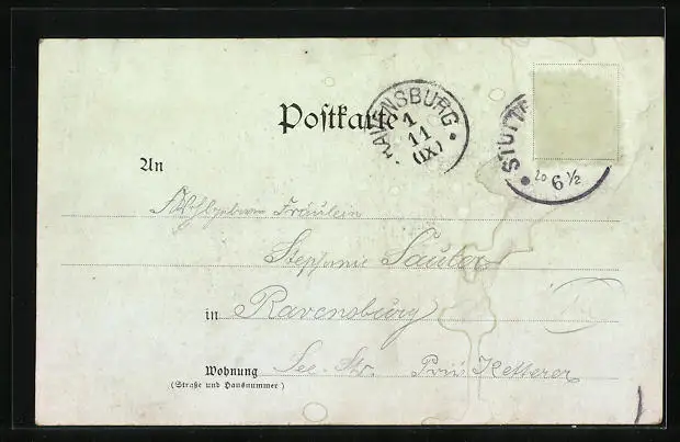 Personenbezogene Daten auf der Rückseite der Karte wurden durch blauen Textmarker unkenntlich gemacht. Die blauen Stellen sind auf die Vorderseite durchgeweicht und wirken sich negativ auf das Postkartenfoto aus