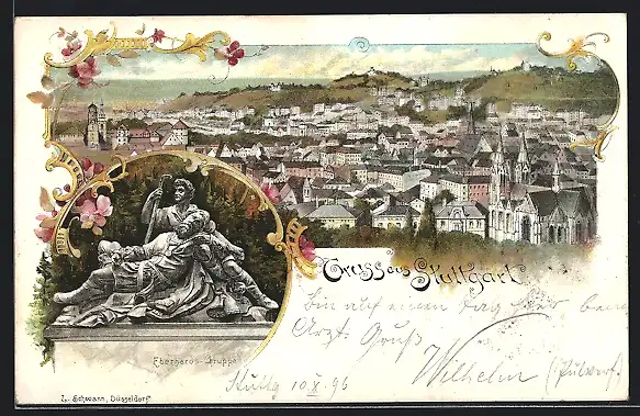 Lithographie Stuttgart, Totalansicht der Stadt, die Eberhards-Gruppe