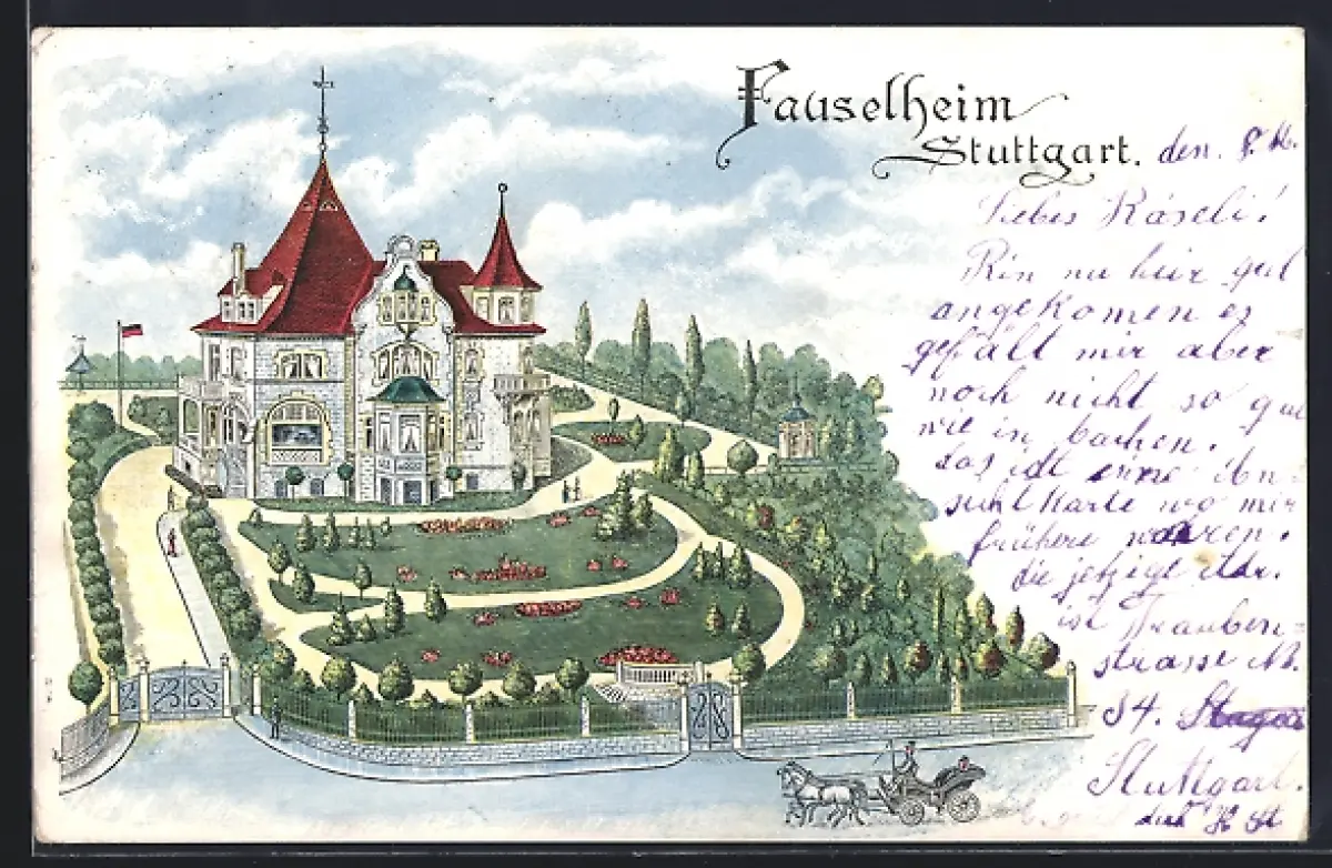 Lithographie Stuttgart, Villa Fauselheim, Pferdekutsche