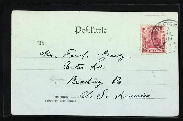 Personenbezogene Daten auf der Rückseite der Karte wurden durch blauen Textmarker unkenntlich gemacht. Die blauen Stellen sind auf die Vorderseite durchgeweicht und wirken sich negativ auf das Postkartenfoto aus
